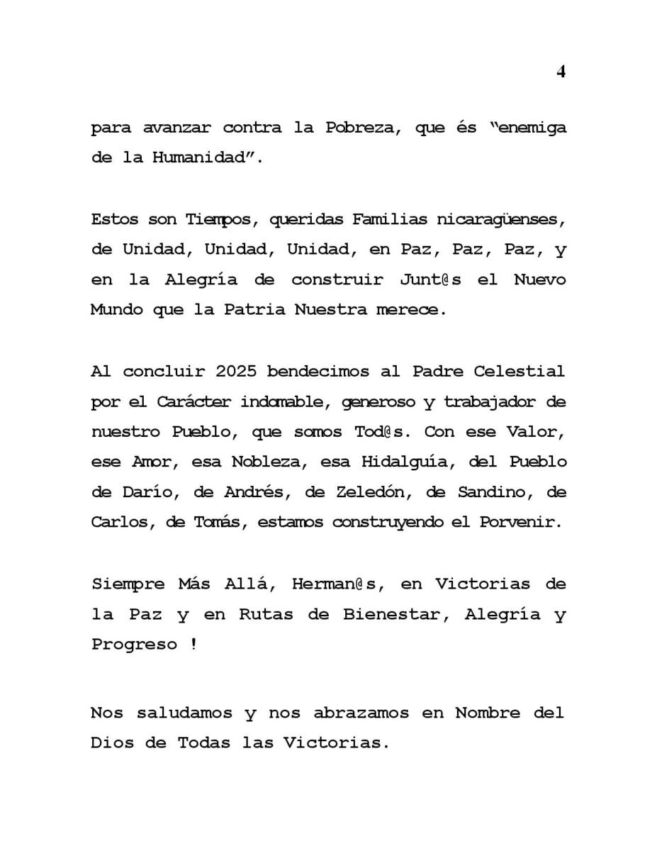 Al concluir 2025 bendecimos al Padre Celestial por el Carácter indomable, generoso y trabajador de nuestro Pueblo, que somos Todos. Con ese Valor, ese Amor, esa Nobleza, esa Hidalguía, del Pueblo de Darío, de Andrés, de Zeledón, de Sandino, de Carlos, de Tomás, estamos construyendo el Porvenir.