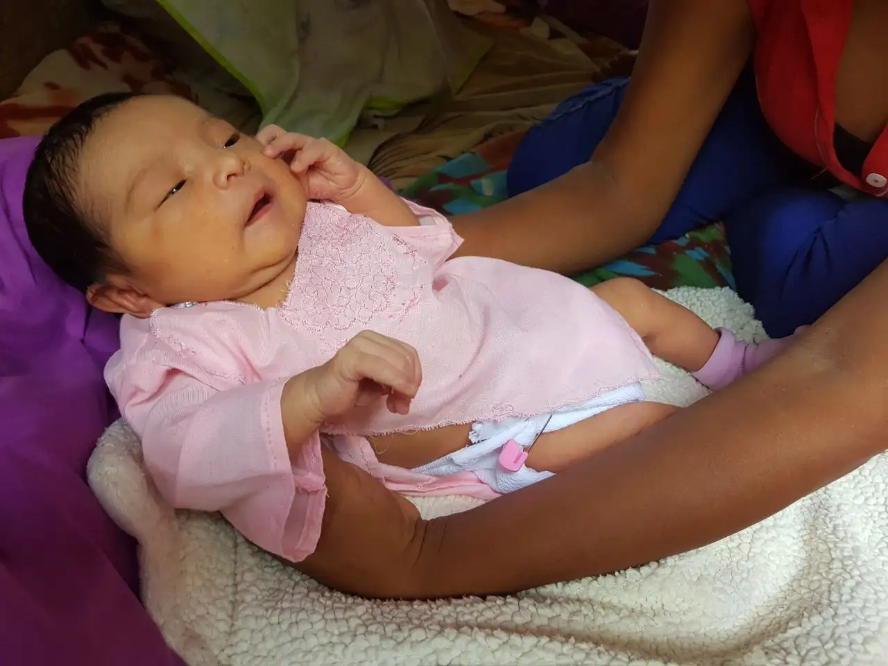 Luciendo una hermosa bata rosada encontramos este martes a la pequeña María de Jesús Sánchez Gaitán, quien con apenas tres días de nacida se ha convertido en noticia nacional por haber nacido durante el recorrido de las carretas peregrinas hacia el Santuario de Jesús del Rescate, en Popoyuapa, Rivas.