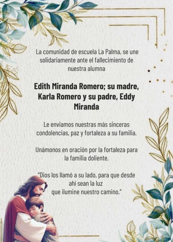 La comunidad educativa de la escuela La Palma, donde estudiaba la niña Edith Miranda Romero, publicaron un mensaje póstumo ante el fallecimiento de la alumna y sus padres.