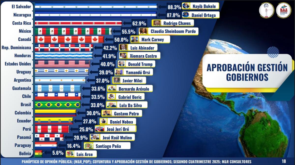 Así lo reveló M&R Consultores, al presentar los resultados de la encuesta M&R POP AMÉRICAS Coyuntura y Aprobación de Gobiernos, la onceava ola del II cuatrimestre 2025, en la que fueron evaluadas 23 naciones.