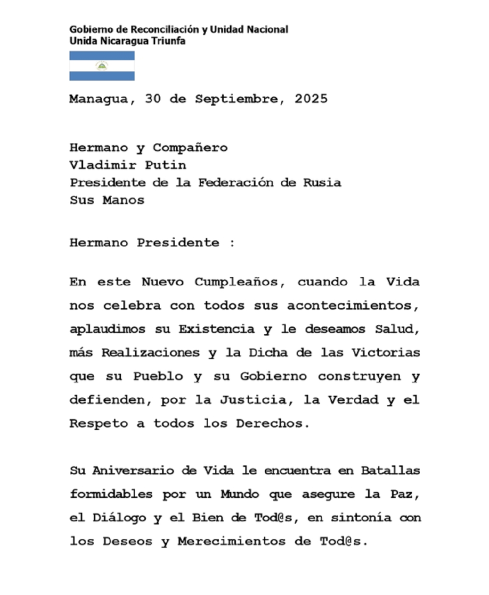 En la misiva, Nicaragua expresa su reconocimiento al mandatario ruso, destacando su liderazgo en la defensa de la justicia, la verdad y el respeto a los derechos de los pueblos.