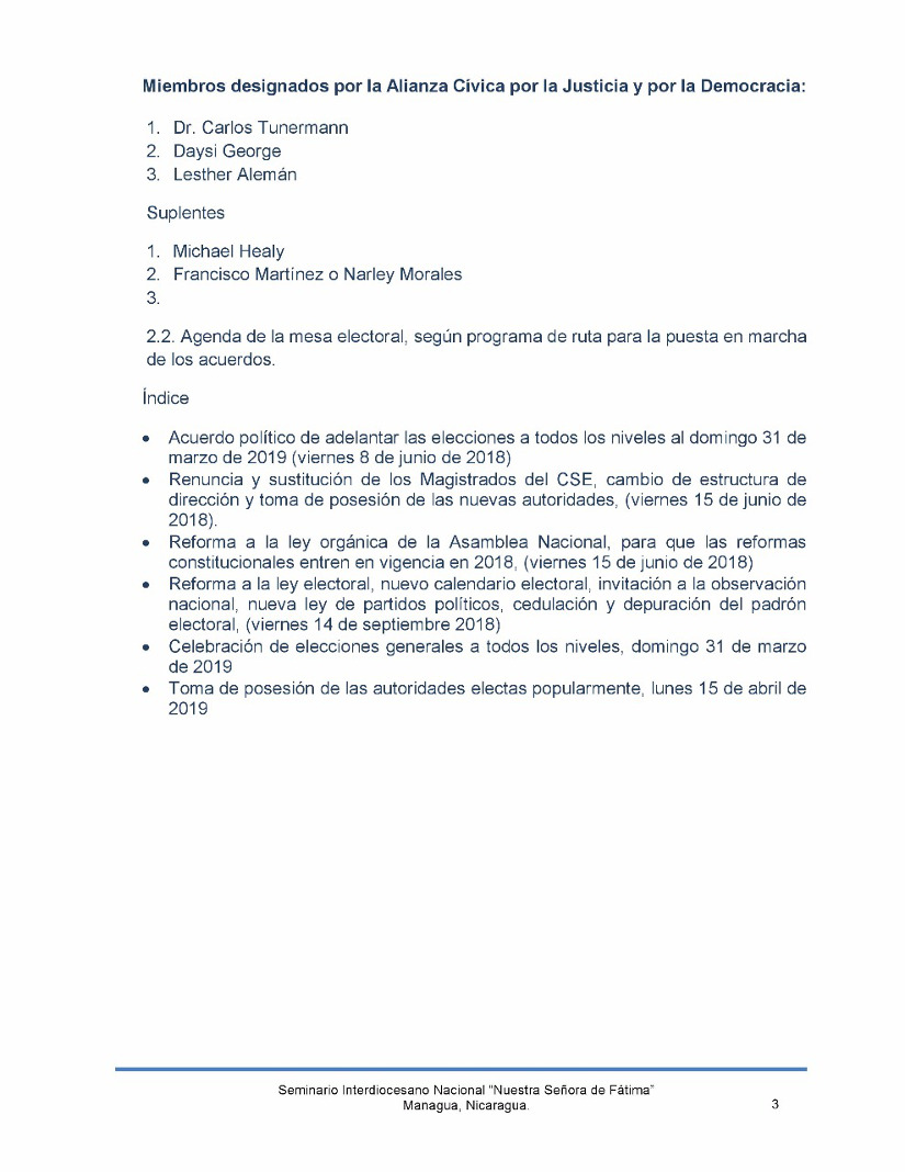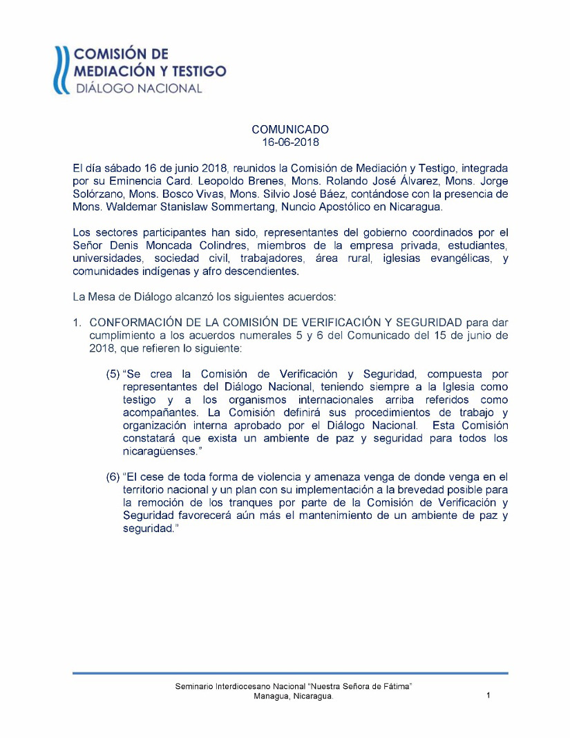 El día sábado 16 de junio 2018 reunidos la Comisión de Mediación y Testigo, integrada por su Eminencia Card. Leopoldo Brenes, Mons. Rolando José Álvarez, Mons. Jorge Solórzano, Mons. Bosco Vivas, Mons. Silvio José Báez, contándose con la presencia de Mons. Waldemar Stanislaw Sommertang, Nuncio Apostólico en Nicaragua.