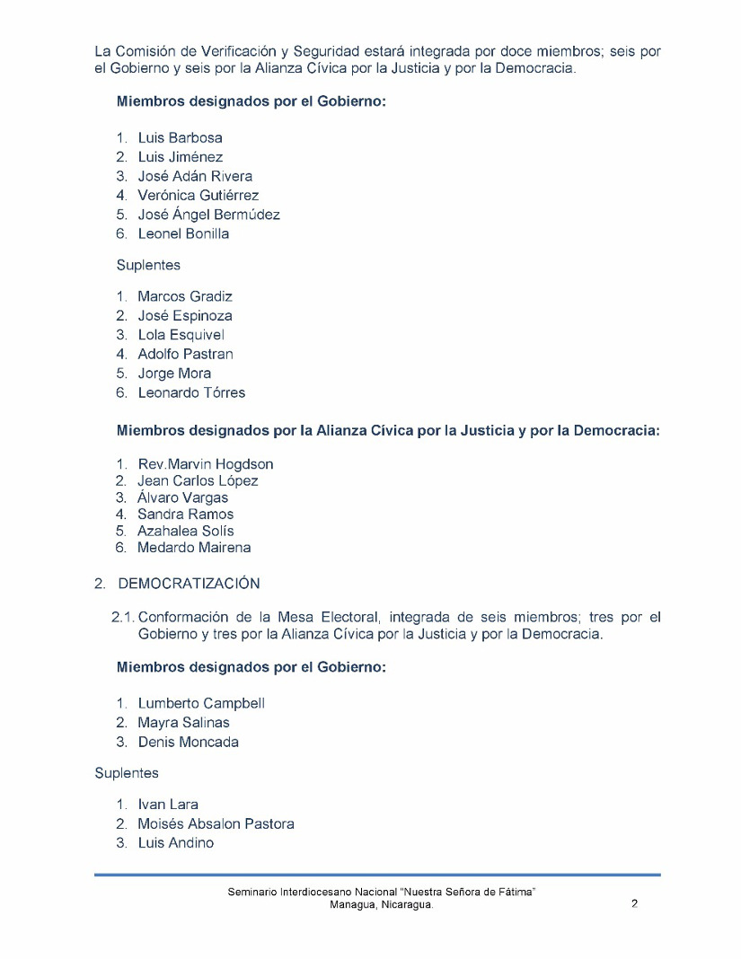 2.1. Conformación de la Mesa Electoral, integrada de seis miembros; tres por el Gobierno y tres por la Alianza Cívica por la Justicia y por la Democracia.