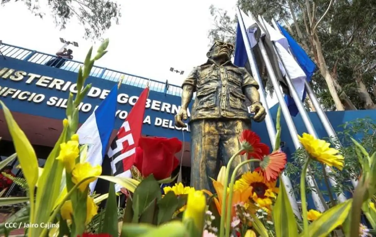 El homenaje incluyó la colocación de flores en una escultura con la figura del Comandante Tomás Borge, ubicada en la entrada al Ministerio de Gobernación.