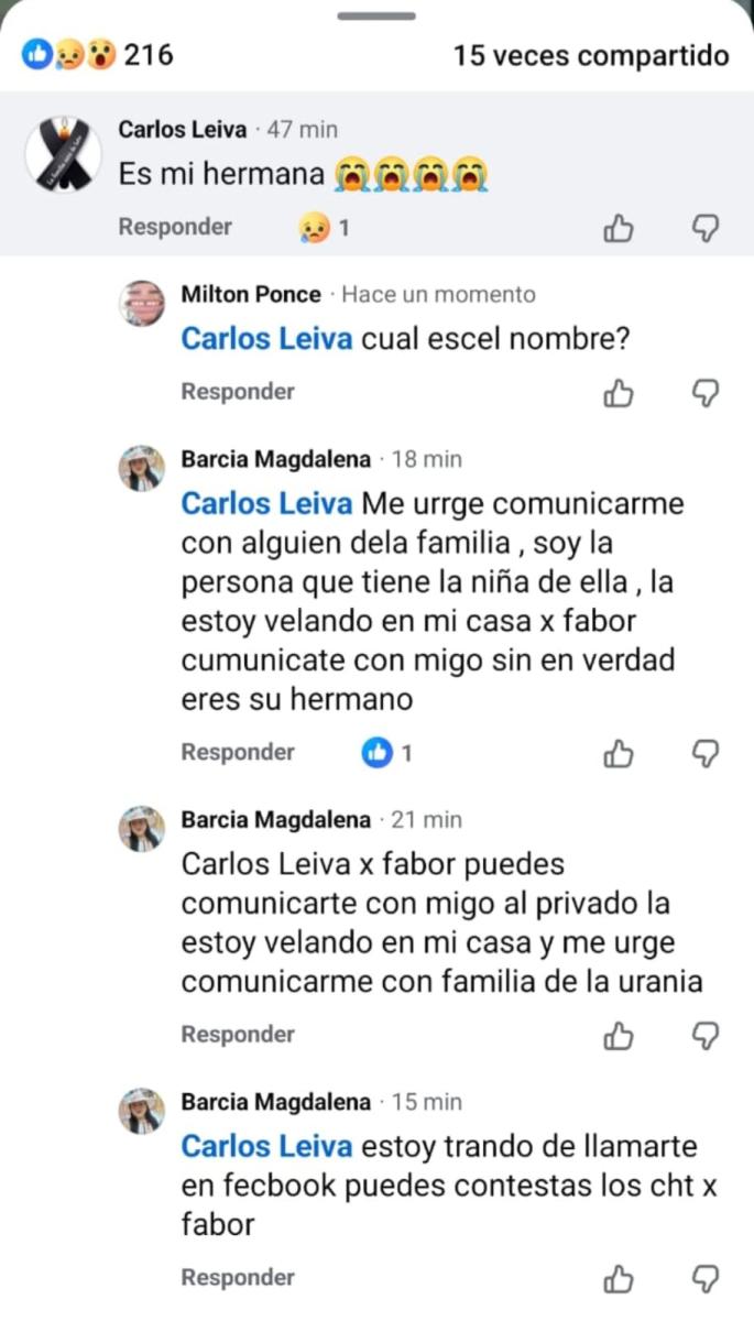 Seguidamente, otra usuaria hizo un llamado a Carlos Leiva para que se comunicará con ella, pues bajo su resguardo tiene a la hija de Urania, quien es velada desde esta noche.