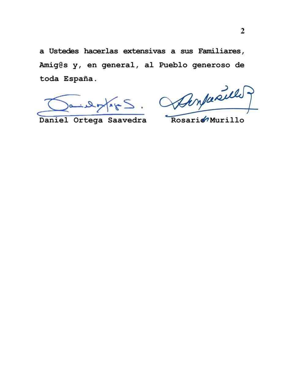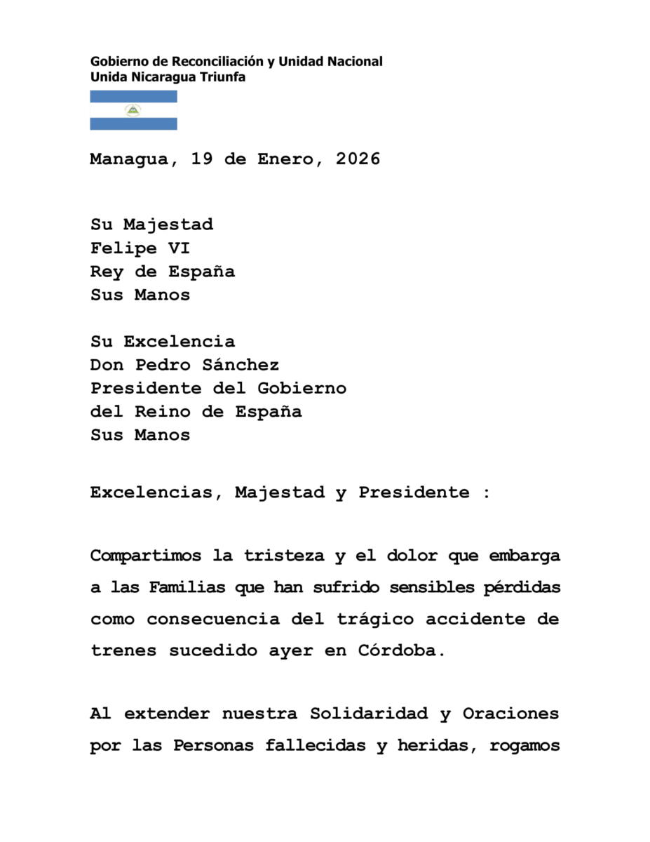 El Gobierno de Reconciliación y Unidad Nacional envió este lunes un mensaje oficial de condolencias y solidaridad a Su Majestad Felipe VI, Rey de España, y al Presidente del Gobierno español, Don Pedro Sánchez, tras el trágico accidente de trenes ocurrido recientemente en la ciudad de Córdoba.