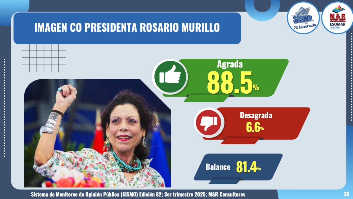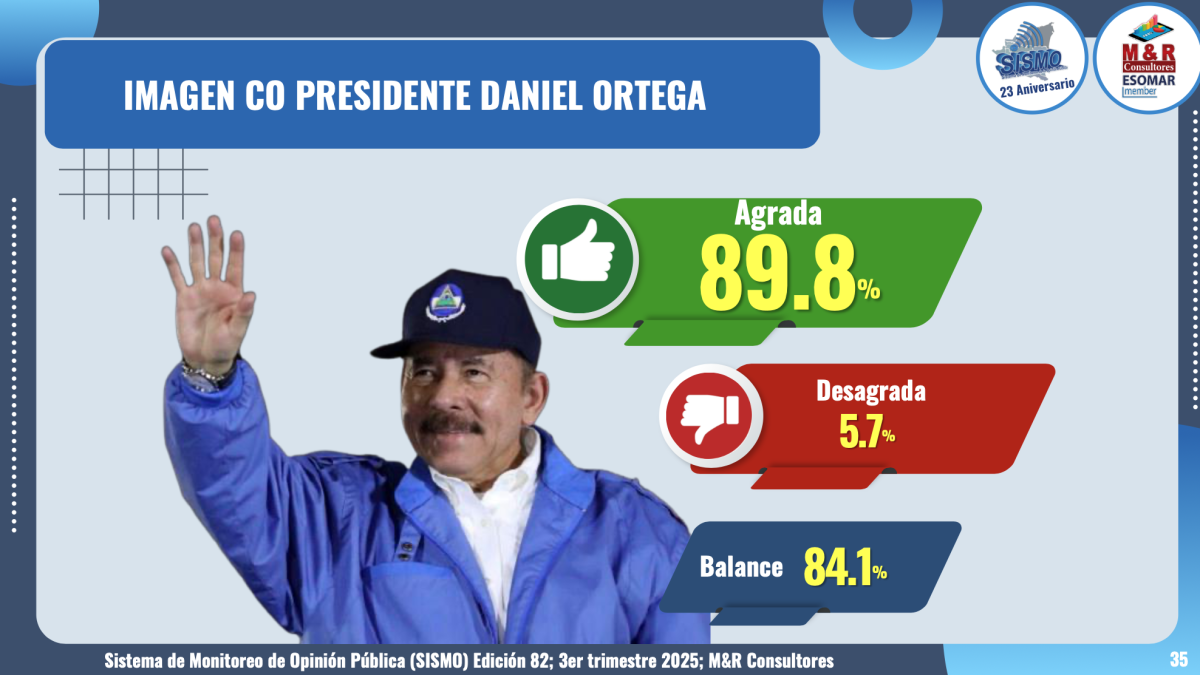 La firma M&R Consultores reveló que los resultados de una encuesta correspondiente al tercer trimestre de 2025, destacó un alto nivel de aprobación en la gestión del Gobierno Copresidido por el Comandante Daniel Ortega y la compañera Rosario Murillo.
