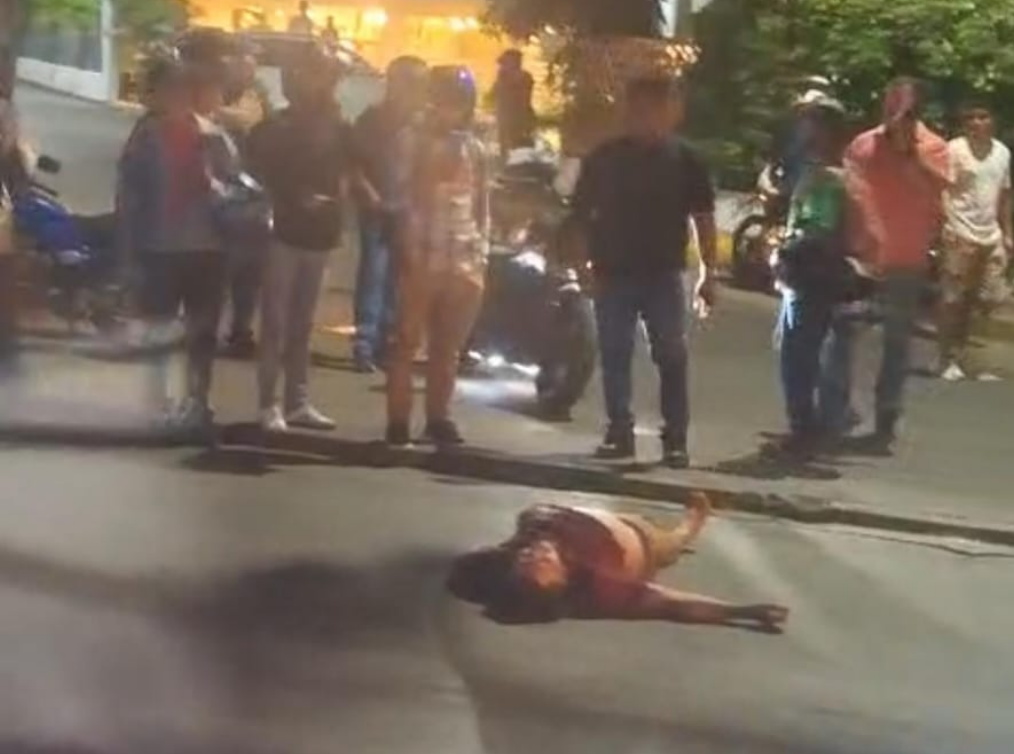 La fémina de tez blanca, viste una licra color negro y una camisa estampada a flores, en tanto, el varón anda de short crema y camisa color rojo vino, sus zapatos deportivos rojos con negro quedaron a varios metros de distancia.