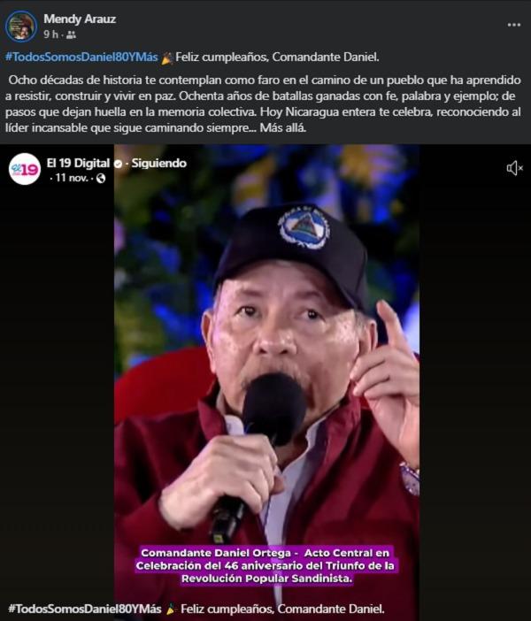 “Ocho décadas de historia te contemplan como faro en el camino de un pueblo que ha aprendido a resistir, construir y vivir en paz. Ochenta años de batallas ganadas con fe, palabra y ejemplo; de pasos que dejan huella en la memoria colectiva. Hoy Nicaragua entera te celebra, reconociendo al líder incansable que sigue caminando siempre… más allá”, escribió la Compañera Mendy Arauz Silva, Ministra de Educación.