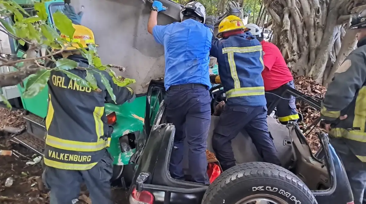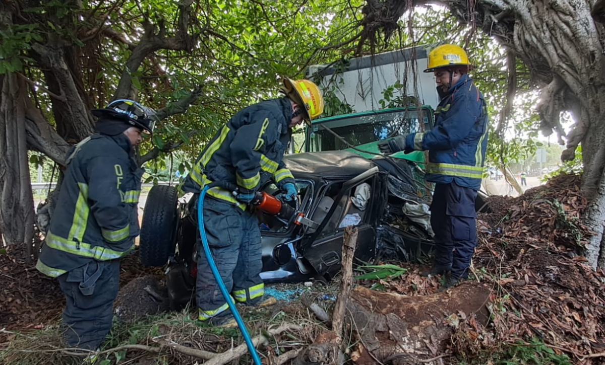 Los Bomberos Unidos utilizaron varias máquinas y técnicas para lograr sacar el cuerpo, que quedo retorcido dentro del Jeep, incrustado en la parte delantera del camión.