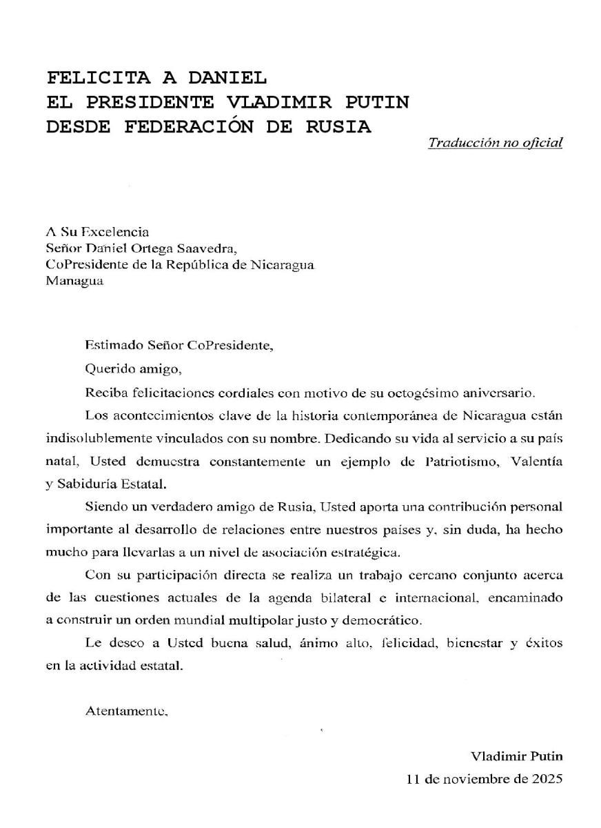 El Presidente de la Federación de Rusia Vladimir Putin felicita al Copresidente Daniel Ortega por su 80 cumpleaños, este 11 de noviembre, y resalta su papel en las relaciones Rusia-Nicaragua y en un orden mundial multipolar justo.