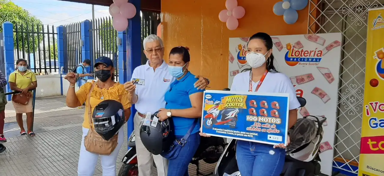 En el Palacio Nacional de la Suerte, Lotería Nacional, éste viernes la comerciante Miriam Medina y la vendedora de lotería, Blanca Rosa López, recibieron sus motos Scooter y un casco, quienes por 20 córdobas ahora tienen su medio de transporte.