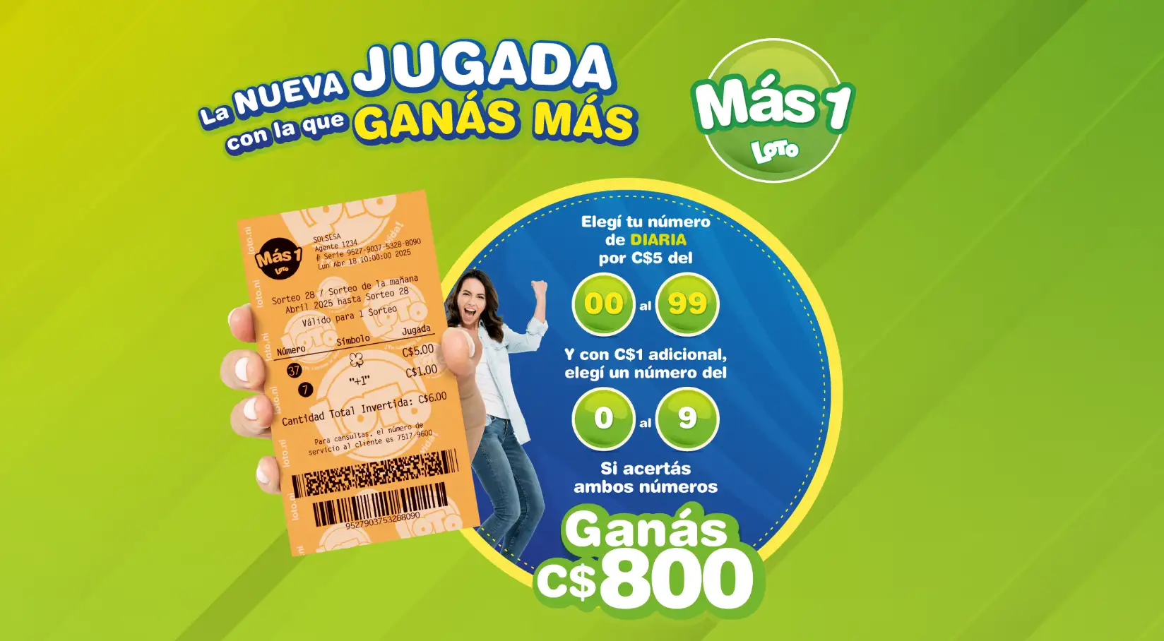 Más 1, le permite al jugador ganar hasta 80 mil córdobas invirtiendo únicamente 600 córdobas, claro, siempre y cuando la suerte lo premie acertando al número ganador de Diaria y al de Más 1.