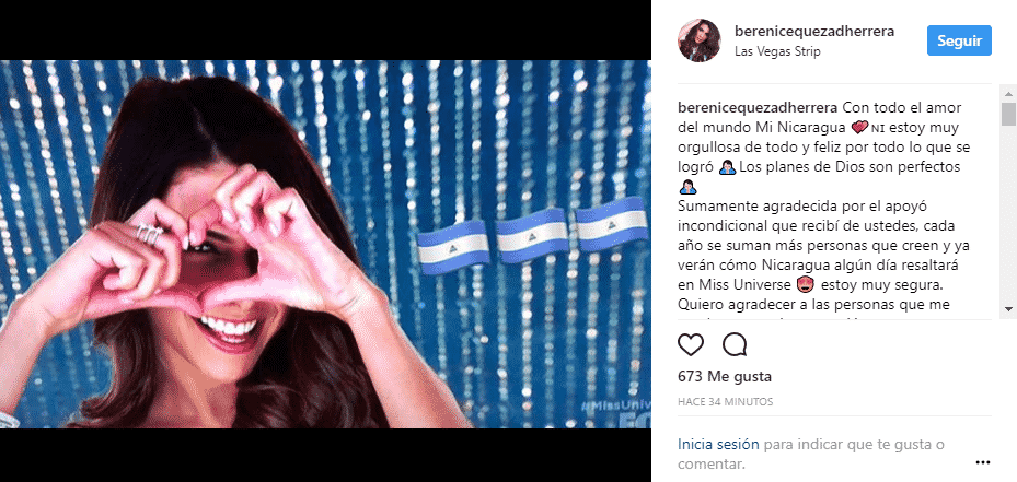La bella Miss Nicaragua 2017, Berenice Quezada utilizó sus redes sociales para agradecer a los nicaragüenses por el apoyo que recibió durante su preparación y competencia en Miss Universo celebrado en Las Vegas, la noche de este domingo.