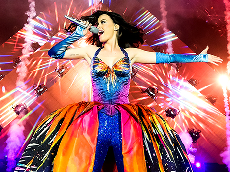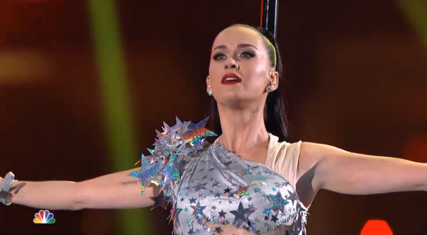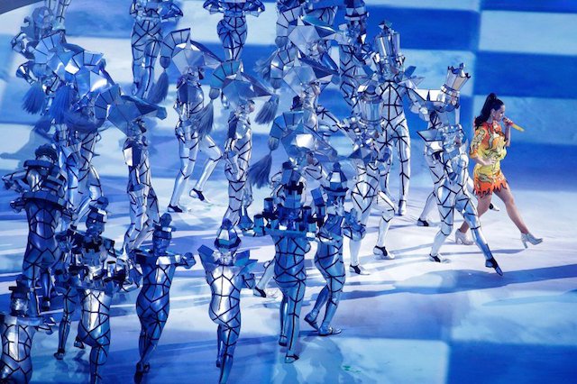 Perry apareció en medio del escenario con un atuendo que simulaba unas llamas, a bordo de un felino mecánico, mientras sonaba su tema «Roar».