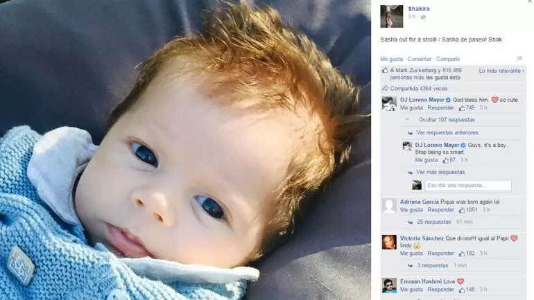 Shakira publicó en su cuenta oficial de Facebook una nueva fotografía de su hijo Sasha, nacido el pasado mes de marzo. Junto a la imagen del pequeño, escribió la leyenda “Sasha de paseo”, que consiguió más de 900 mil likes.