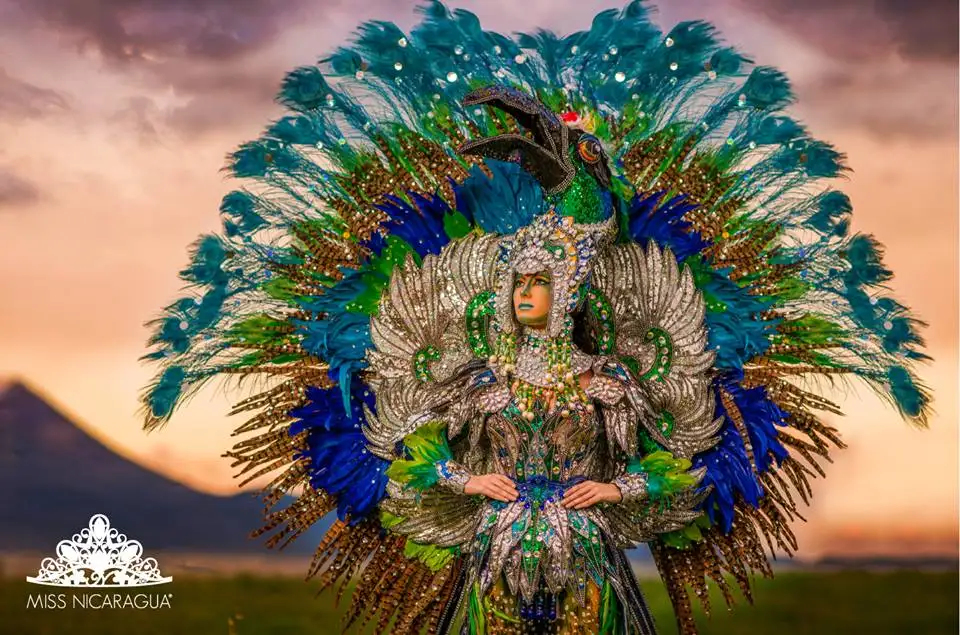 “Mi traje lleva por nombre Guardabarranco, hermano de viento, de canto y de luz”, dice. “Usamos telas con diversidad de lentejuelas. Las alas llevan mucho trabajo. Es un diseño pensado para el escenario de Miss Universo, recordemos que este concurso es un show”, dijo su creador Neftalí Espinoza.