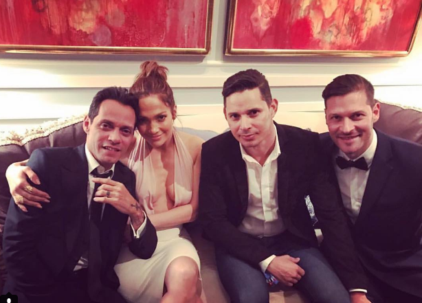 El cantante cubano Leoni Torres fue quien compartió una foto donde aparece sentado en un sillón al lado de Marc y JLo en la fiesta post Grammy.