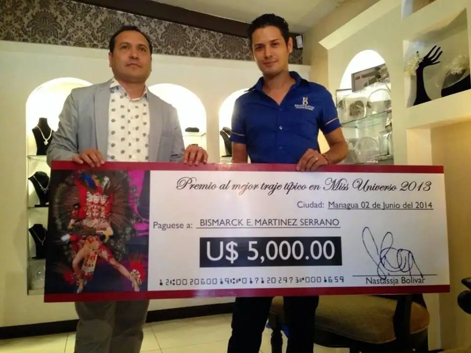 Con una sonrisa de oreja a oreja se encuentra el diseñador Bismarck Martínez, ya que hoy recibió el cheque por 5 mil dólares que le había prometido entregar la miss Nicaragua 2013, Nastassja Bolívar, por haber ganado el primer lugar de traje nacional en miss Universo, con un conjunto diseñado por él.