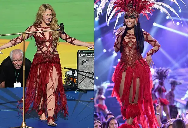 Todo iba muy hasta que los fashionistas comenzaron a hacer las comparaciones del traje rojo estilo carnaval que vistió la rapera con varias plumas en su cabello negro. Lo que no sabía Nicki es que su vestido había sido usado hace más de un año por Shakira en la clausura del mundial de fútbol 2014.