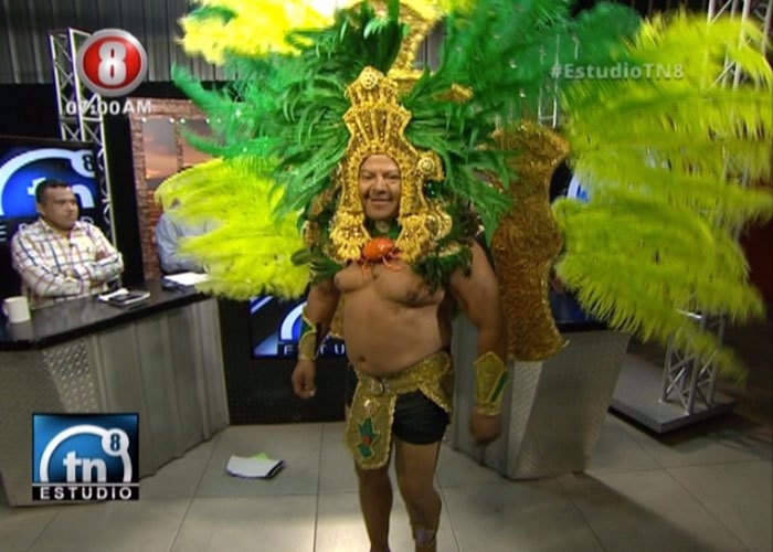 “El palomo Berrios”, a como le decimos sus compañeros de trabajo, lució un traje del diseñador Bismark Martínez y ante las cámaras demostró sus habilidades bailando samba con el traje lleno de plumas, mientras que nuestro otro colega Calixto Valle lo quedaba viendo con envidia.