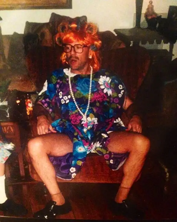 Con peluca pelirroja, aretes, collar y un vestido con estampado floral, Willis aparece sentado en un sofá. Scout acompañó la imagen con la frase «creador de cinco hijas».