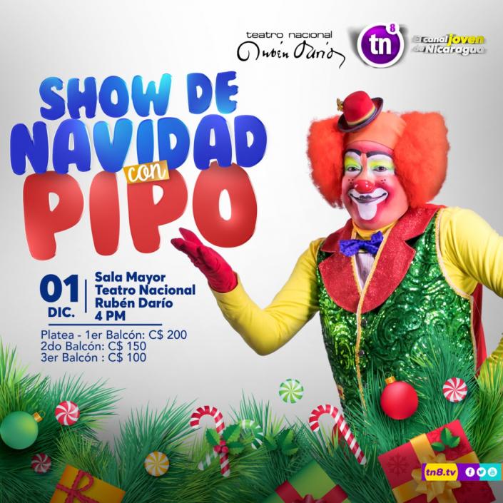 Grandes y chicos disfrutarán el domingo primero de diciembre del Show Navideño del Payaso Pipo, a realizarse en punto de las cuatro de la tarde en la Sala Mayor del Teatro Nacional.