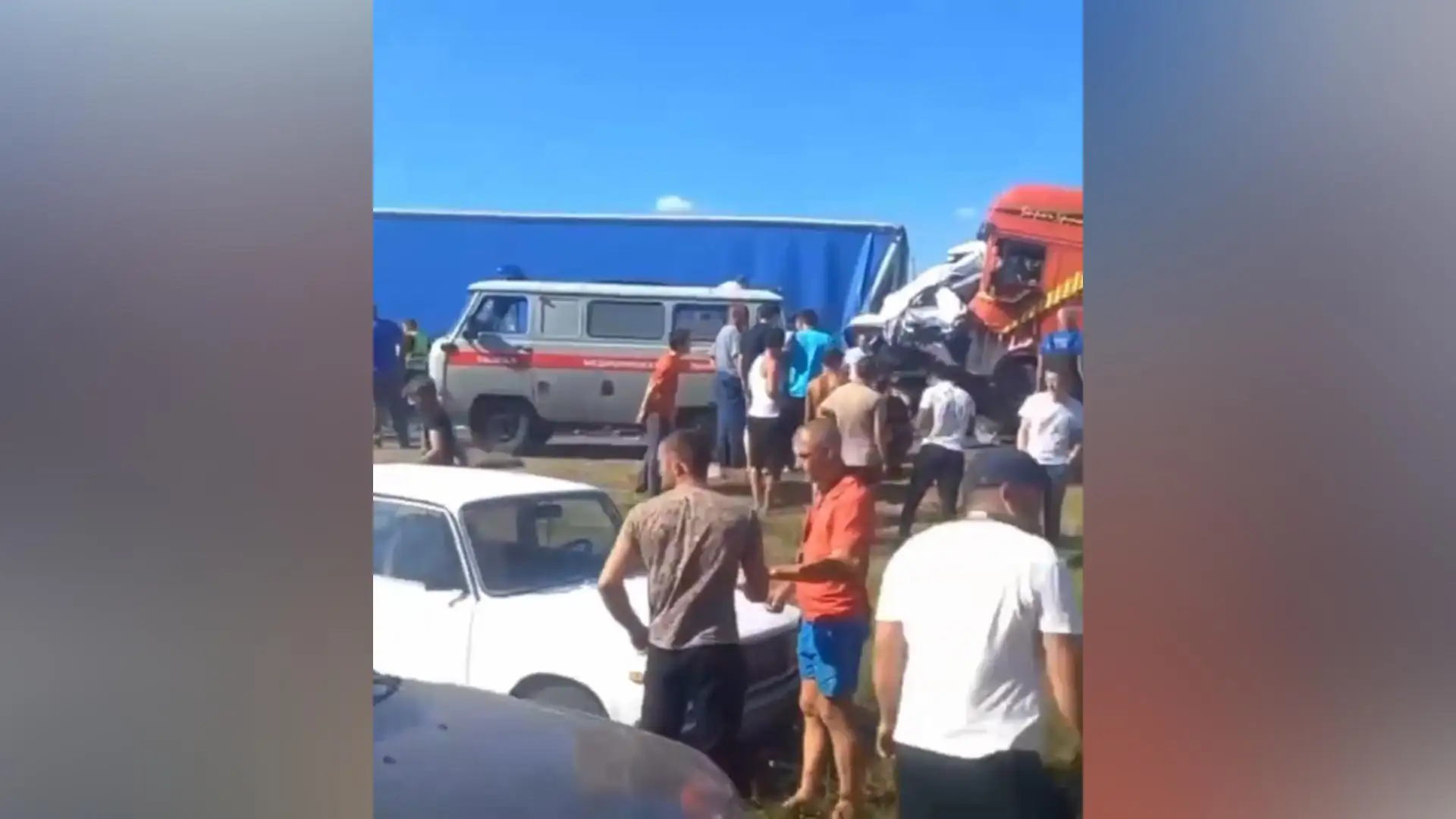 El lamentable accidente ocurrió en la carretera que une las localidades de Novospásskoye y Nikoláevka; cuando el conductor de uno de los camiones se estrelló de frente contra el microbús que transportaba a 18 pasajeros.