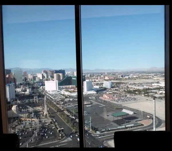 Cuando va hacia la ventana, se aprecia la famosa pirámide del hotel Luxor y, posteriormente, el terreno donde el domingo 22 mil personas estuvieron reunidas sin imaginar el desenlace fatal.