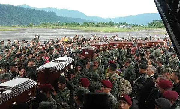 Tras una marcha militar y un toque de silencio en el campamento militar de la población de Shell, los cuerpos de los fallecidos fueron trasladados este miércoles a Quito, donde se instalará la capilla ardiente y se celebrará una misa.