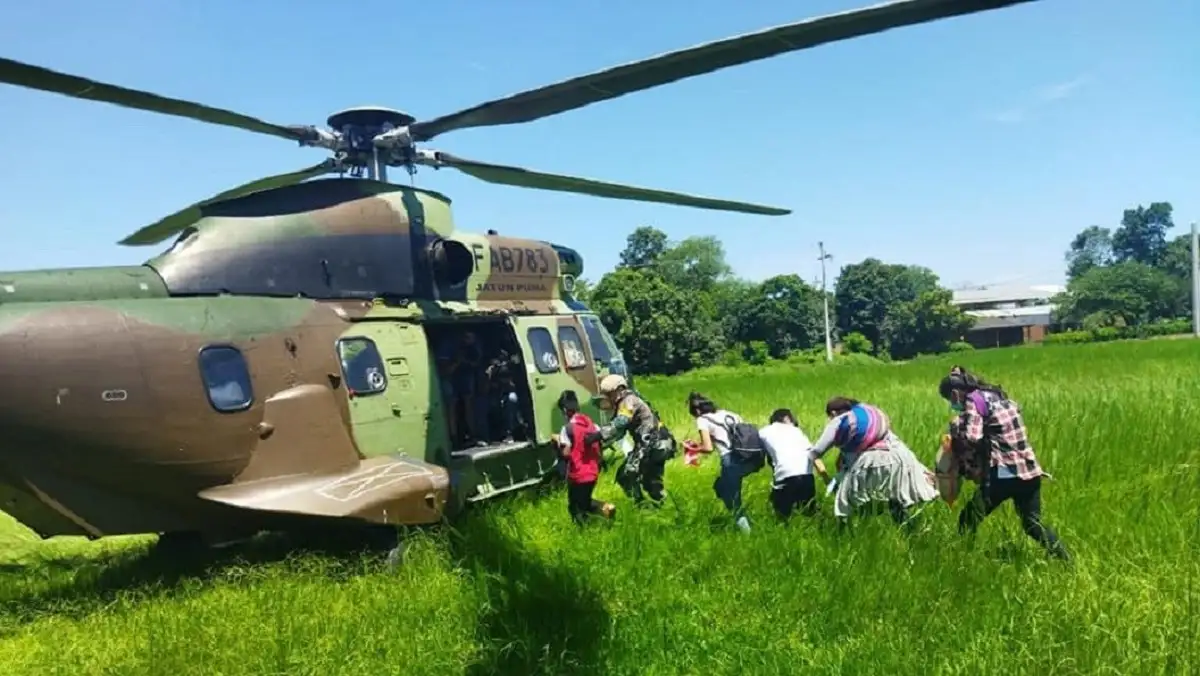Un helicóptero militar divisó a la familia y procedió a aterrizar con mucha cautela ya que tenía temor de volcar la canoa con el viento generado por sus hélices, según comentó Juan Carlos Calvimontes, viceministro de Defensa Civil.