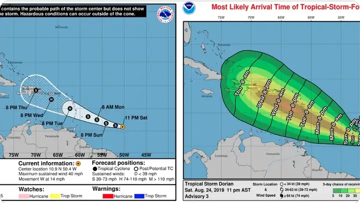 Este domingo la tormenta Dorian se ubicaba a 748 kilómetros al sureste de Barbados, con vientos máximos de 65 kilómetros por hora y con una velocidad de traslación de 6.4 kilómetros por hora.
