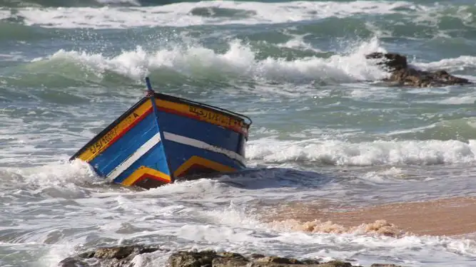 La embarcación de madera, en la que viajaban unos 40 inmigrantes magrebíes, quedó destrozada al chocar con una zona rocosa de la playa en la costa de Caños de Meca, en Cádiz, España.