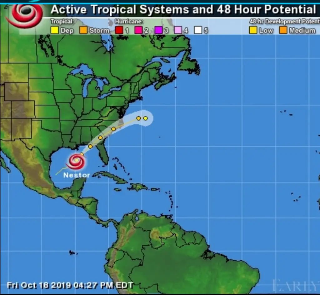 Los meteorólogos pronostican que Néstor, que se desplaza rápidamente a 22 millas por hora (35 km/h), se moverá el sábado y el domingo a través del sureste de Estados Unidos, lo que le debilitará paulatinamente hasta convertirlo en un ciclón postropical.