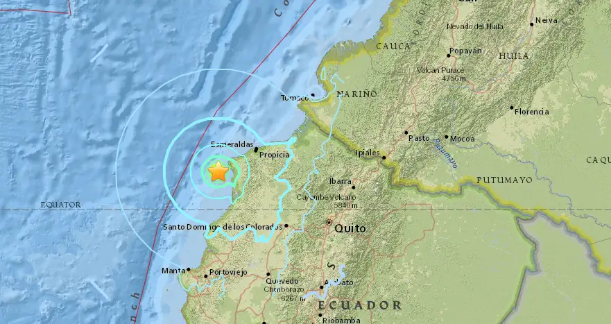 Este viernes se ha registrado un sismo de magnitud 5,8 a 26 kilómetros de Muisne, un cantón situado al oeste de la Provincia de Esmeraldas, en Ecuador. El epicentro del sismo se localizó a una profundidad de 10 kilómetros, informa el Instituto Geofísico.