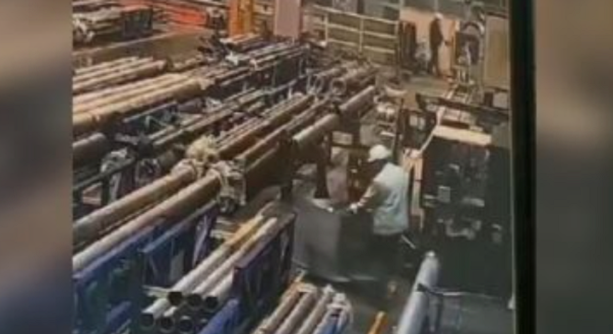 En la grabación que circula en redes sociales se puede ver que el trabajador de la empresa camina entre máquinas y material terminado arrastrando un contenedor móvil, sin embargo, al llegar a cierto punto decide continuar su camino, pero en reversa para aparentemente tener una mejor movilidad en el reducido espacio.