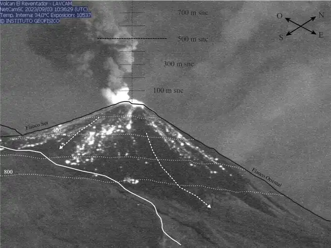 La situación se agrava al considerar la emisión de material incandescente que ha llegado hasta los 200 metros sobre el nivel del cráter. Dicho material, al descender, provoca el rodamiento de bloques en los flancos del volcán. Durante el último día, se registraron 25 explosiones, siendo 17 de ellas de duración prolongada.