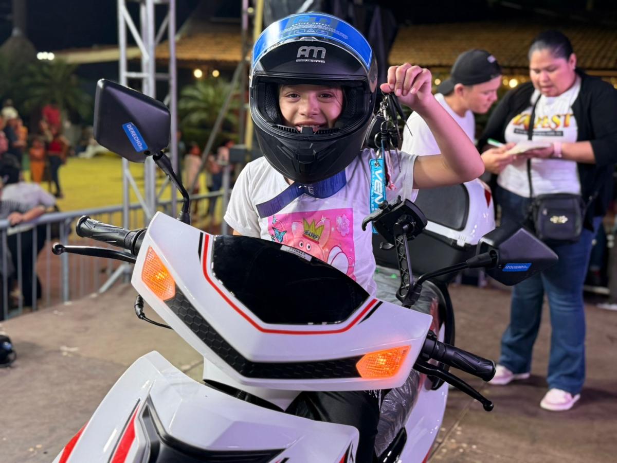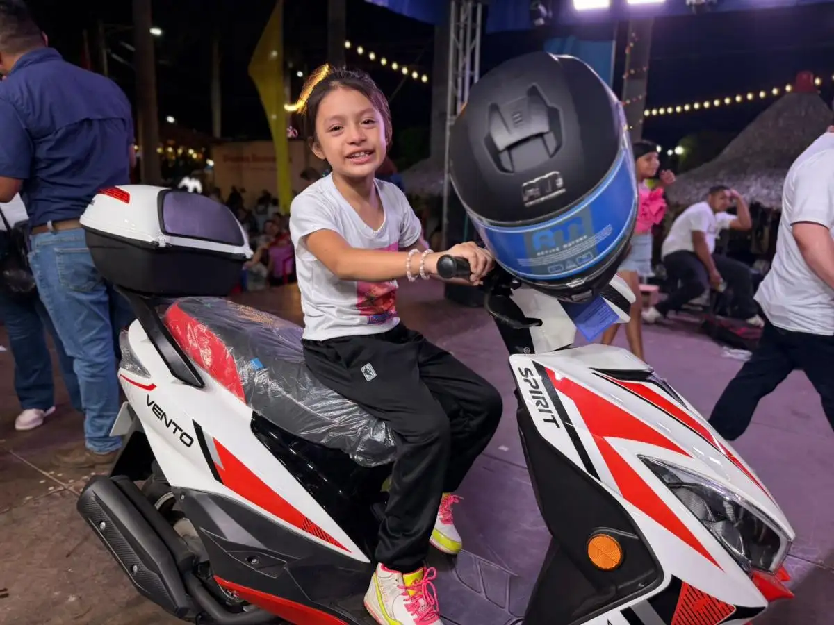 Con una sonrisa de oreja a oreja quedó la niña Aisha Zahira Luna Vanegas, de 9 años, al ganar la motocicleta marca Vento, modelo Spirit 150, nueva de paquete, distribuida por Kbra Motors, valorada en mil 500 dólares, rifada en el Ya Fest 2025, Fiestón Navideño de Tu Nueva Radio Ya, realizado este domingo en el Puerto Salvador Allende.