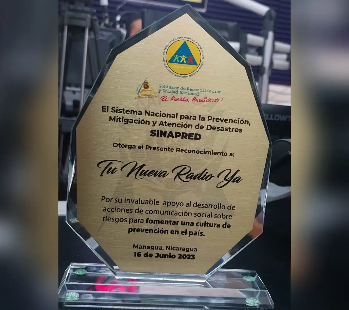 Las autoridades del Sistema Nacional para la Prevención, Mitigación y Atención de Desastres (SINAPRED) entregaron reconocimiento al colectivo de La Nueva Radio YA por su invaluable apoyo en la comunicación social para una cultura de prevención ante los fenómenos naturales en Nicaragua.