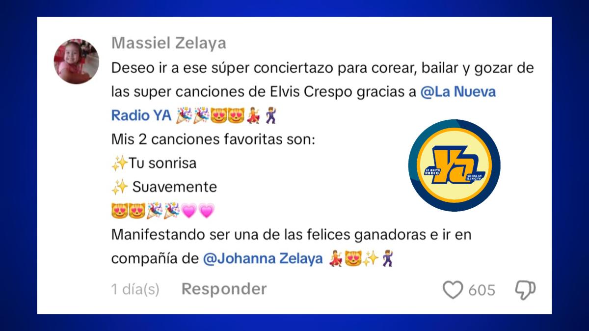 Massiel Zelaya comentó…“Deseo ir a ese súper conciertazo para corear, bailar y gozar de las súper canciones de Elvis Crespo gracias a @La Nueva Radio YA… Mis 2 canciones favoritas son: Tu sonrisa y Suavemente”