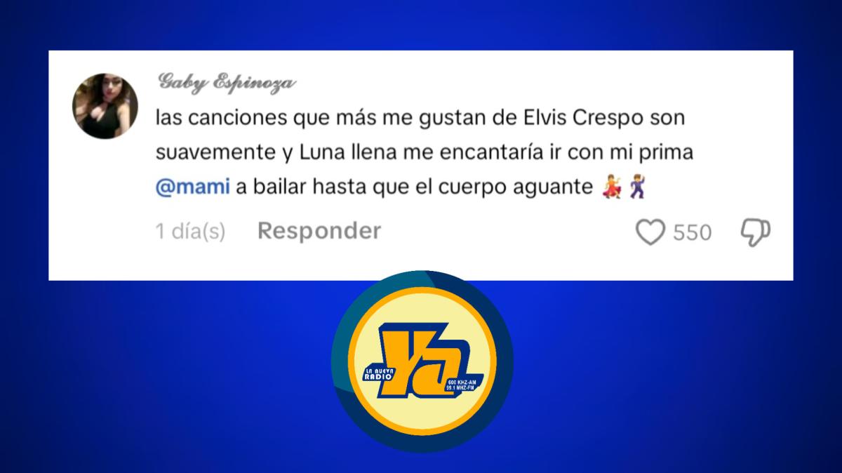 En tanto Gaby Espinoza escribió…“Las canciones que más me gustan de Elvis Crespo son Suavemente y Luna llena, me encantaría ir con mi prima @mami (Arlen Arana), a bailar hasta que el cuerpo aguante”.
