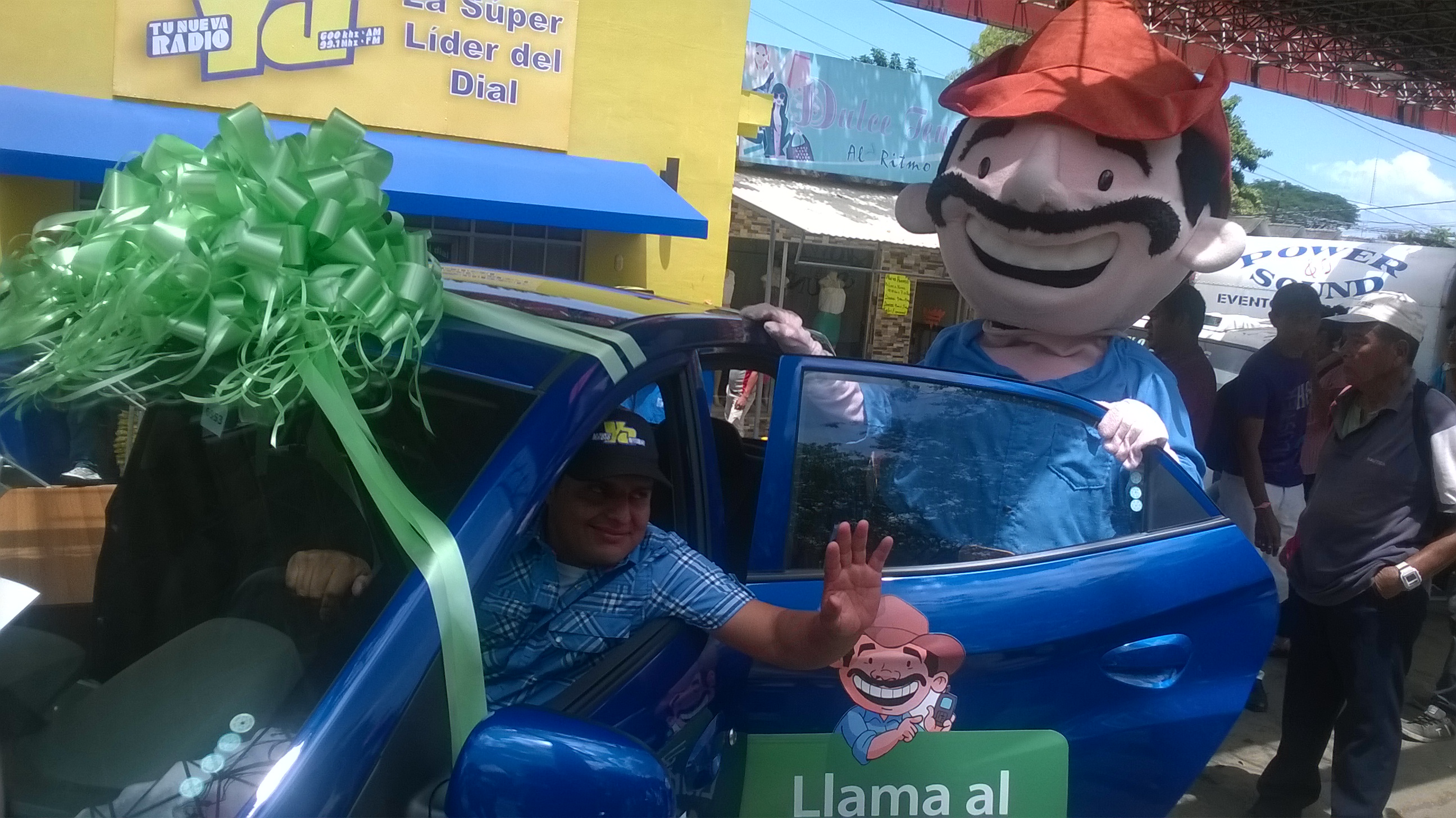 En un ambiente de emoción y alegría, La Súper Líder del Dial y Media Interactiva entregaron este viernes a Javier Antonio Medina Sánchez, de 30 años, el primero de tres autos Hyundai modelo EON del año 2015, que están siendo rifados a través de la Súper Promoción de “Juancho Billetón”.