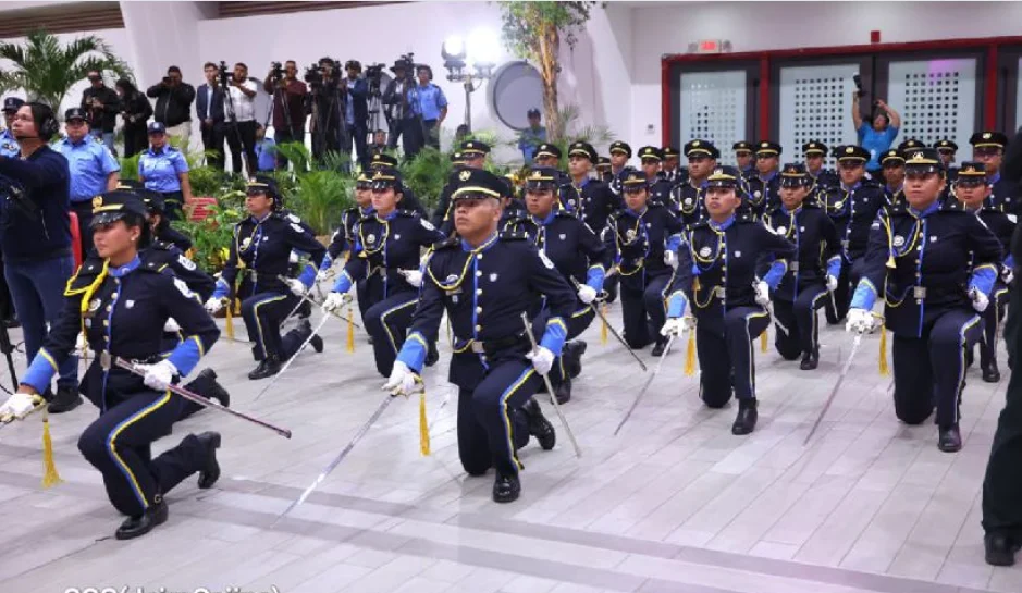 Acompañan los miembros de la Jefatura Nacional de la Policía Nacional, compañera Reyna Rueda, alcaldesa de Managua; miembros del Gabinete del Gobierno de Reconciliación y Unidad Nacional; miembros del Consejo Militar del Ejército de Nicaragua, jefas y jefes de Policías de las cojefaturas, especialidades nacionales y órganos de apoyo; miembros del Consejo Nacional del Ministerio del Interior, miembros del Consejo Nacional de Rectores de Universidades, agregados y agregadas militares y policiales acreditados en el país; oficiales graduandos, claustro docentes de la Universidad de Ciencias Policiales “Leonel Rugama” y familiares.