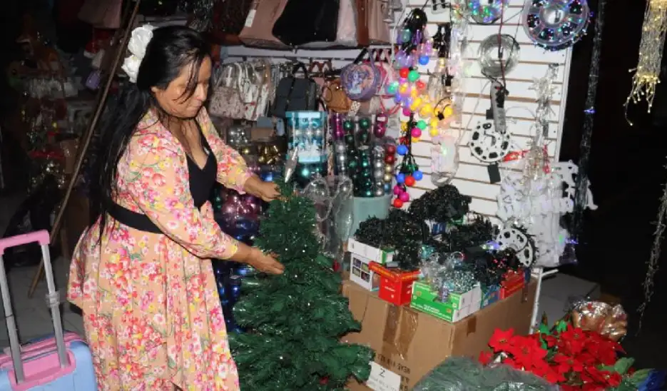 Con la llegada de la Navidad, amigos y compañeros de trabajo realizan intercambios de regalos, y también las familias se preparan para obsequiar el 25 de diciembre. En el puesto de Marbelly Arias Flores aún se pueden encontrar luces y adornos navideños, así como carteras y maletas.