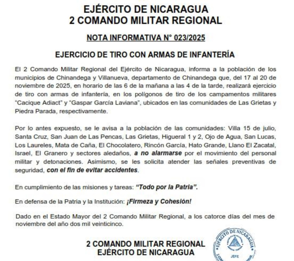 El Segundo Comando Militar Regional del Ejército de Nicaragua ha informado a la población que realizará ejercicios de tiro con armas de infantería en los municipios de Chinandega y Villanueva.