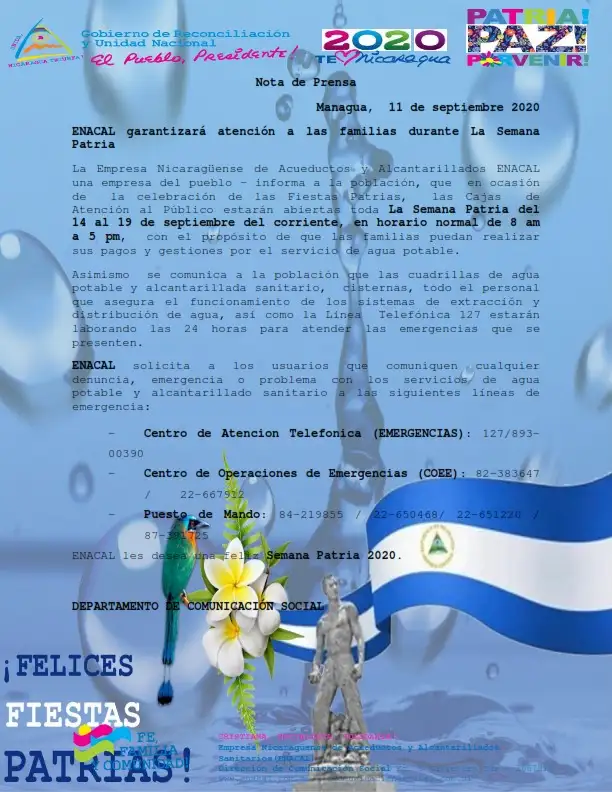 La Empresa Nicaragüense de Acueductos y Alcantarillados (ENACAL) informó este viernes que durante la Semana Patria, garantizarán la atención a las familias nicaragüenses.