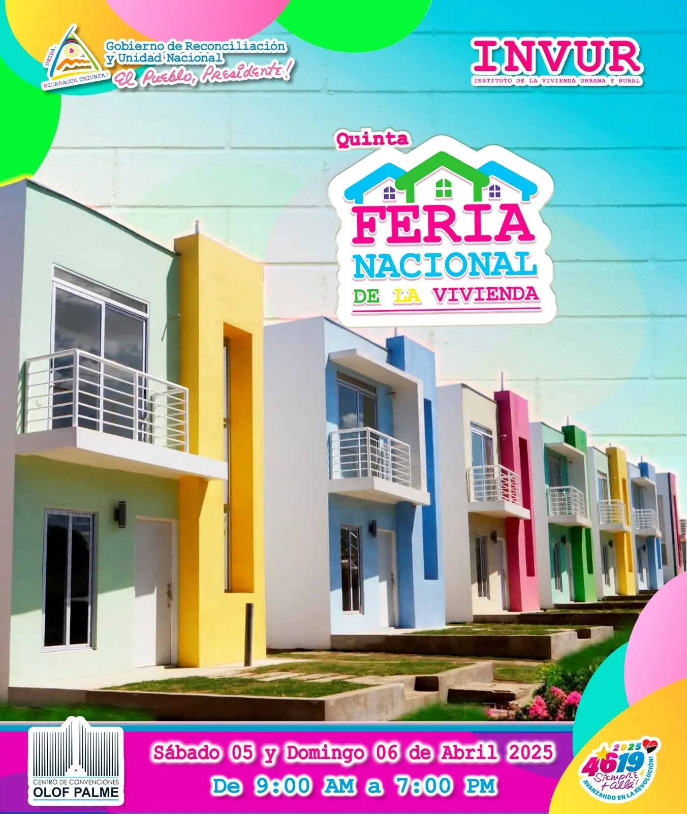 El Instituto de la Vivienda Urbana y Rural (INVUR), bajo el liderazgo del Gobierno de Reconciliación y Unidad Nacional, anunció la realización de la Quinta Feria Nacional de la Vivienda, que se llevará a cabo los días sábado 5 y domingo 6 de abril en el Centro de Convenciones Olof Palme, en Managua.