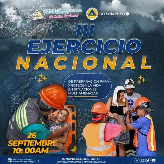 El Gobierno de Nicaragua, a través del SINAPRED, recordó este miércoles que nos disponemos a participar desde nuestras, casas, barrios y comunidades en el III Ejercicio Nacional preparación para proteger la vida en situaciones multi-amenazas este jueves 26 de septiembre a partir de las 10 am.