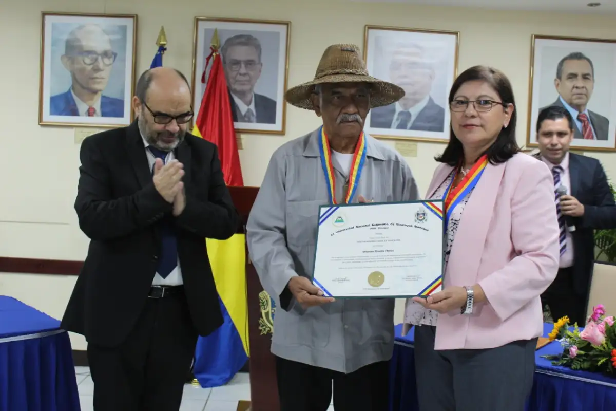 Autoridades de la Universidad Nacional Autónoma de Nicaragua (UNAN) entregaron el título Doctor Honoris Causa en Educación al profesor Orlando Pineda Flores, por su gran aporte a la alfabetización en nuestro país.