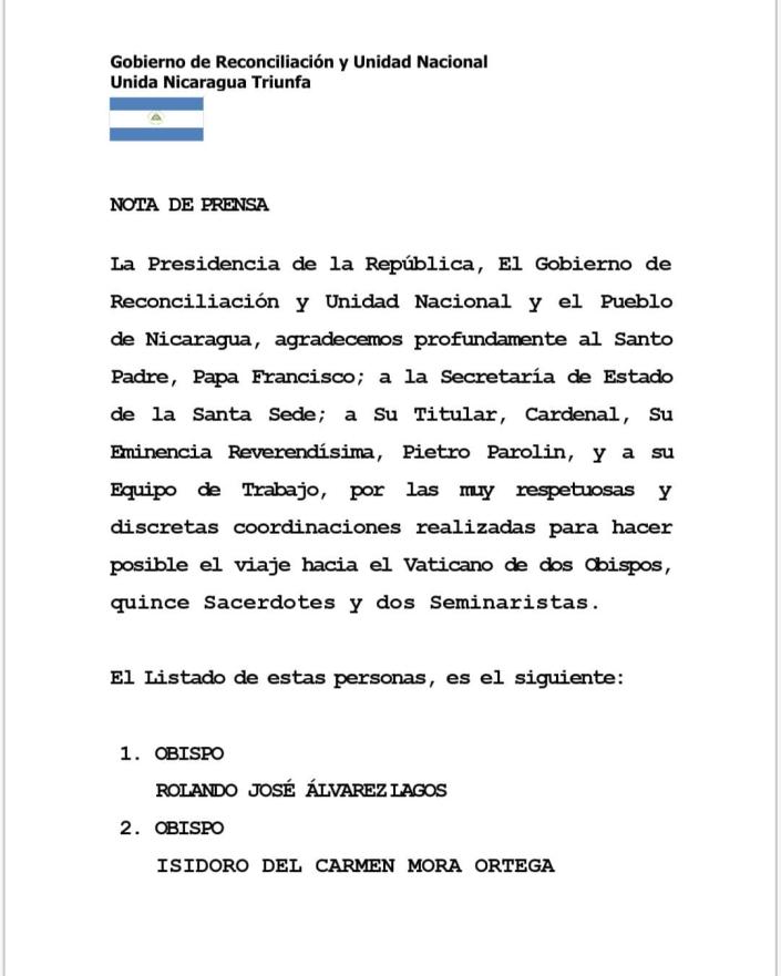 La Presidencia de la República, El Gobierno de Reconciliación y Unidad Nacional y el Pueblo de Nicaragua, agradecemos profundamente al Santo Padre, Papa Francisco; a la Secretaría de Estado de la Santa Sede; a Su Titular, Cardenal, Su Eminencia Reverendísima, Pietro Parolin, y a su Equipo de Trabajo, por las muy respetuosas y discretas coordinaciones realizadas para hacer posible el viaje hacia el Vaticano de dos Obispos, quince Sacerdotes y dos Seminaristas.